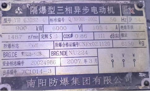 型号:YB630S2-4,功率:900kW,2007年生产 |