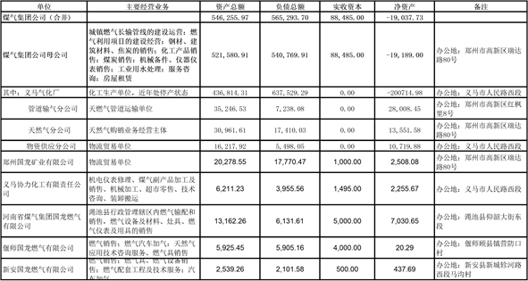 省煤气集团公司于1996年10月经河南省人民政府批准成立,河南能源化工集团化工新材料有限公司全资子公司。省煤气集团公司是以生产煤制天然气为主、同时联产甲醇及化工副产品的大型煤化工企业,公司注册资本5.07亿元,注册地为河南省郑州市瑞达路80号。公司拥有年产天然气5亿立方米、甲醇24万吨、二甲醚20万吨、醋酸20万吨、硝酸铵20万吨、副产品7万吨的化工生产能力,长输燃气管道年输送能力10亿立方米。目前,除义马气化厂因安全事故全部停产外,燃气和其他业务单位均保持正常经营, 公司现有职工1145人。公司下辖四家分公司(义马气化厂、管道输气分公司、天然气分公司、供应分公司)和五家全资子公司(郑州国龙矿业有限公司、河南省煤气集团国龙燃气有限公司、偃师国龙燃气有限公司、新安国龙燃气有限公司、义马协力化工有限责任公司)。相关单位基本情况见下表(单位:万元)