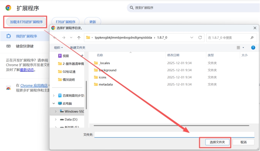 1.打开谷歌浏览【右上角三个点】-【扩展程序】-【管理扩展程序】-【加载未打包的扩展程序】