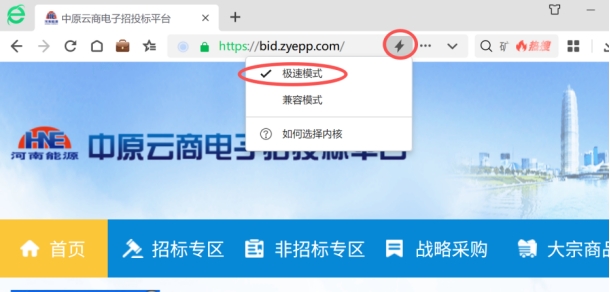 如果使用360安全浏览器,需要点击地址栏后面三个点前面的小标识,选择“极速模式”(部分360浏览器版本需要选“智能切核”),切换后为小闪电样式,如下图: