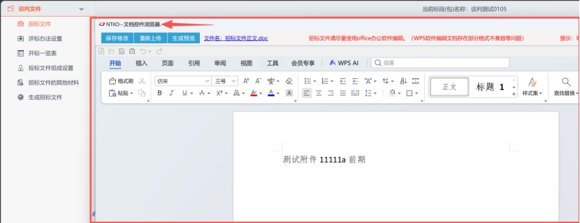 在进行采购文件、评标报告编写等需要office或wps界面支持的文字编辑页面,需要按照页面提示安装NTKO控件,以确保功能正常使用,安装步骤如下: